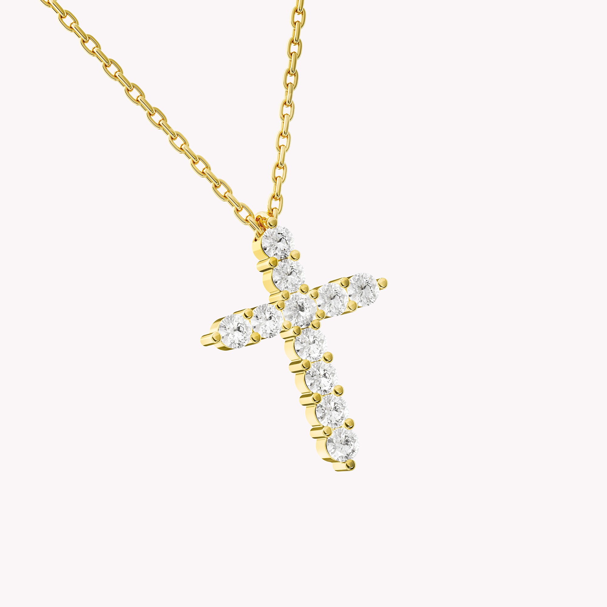 A precious interpretation of a classic motif. Our gold cross pendant in yellow gold is available in various carat weights, the picture shows the cross with 0.08 carat diamonds.
