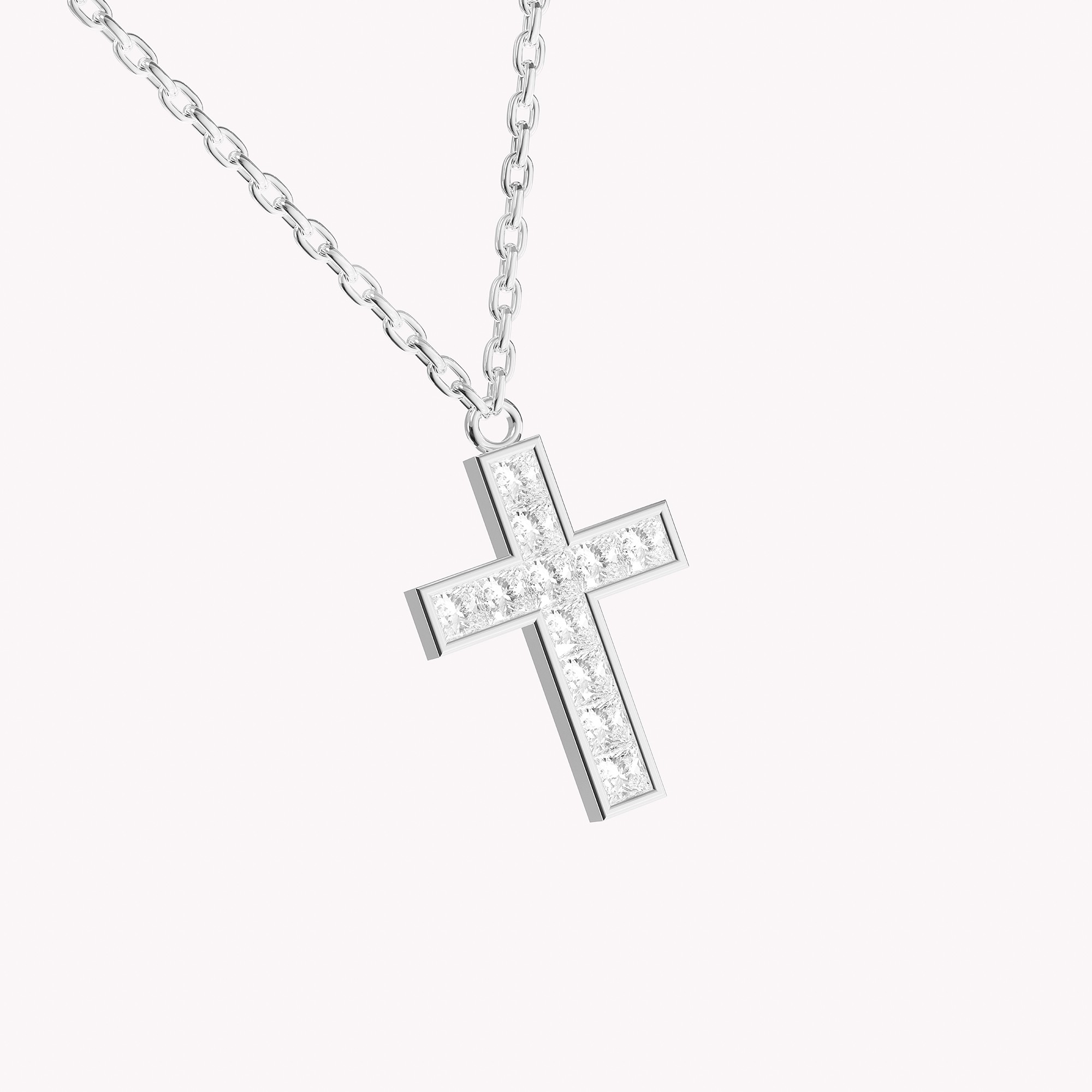 ოქროს ჯვრის გულსაკიდი, თეთრი ოქროს ძეწკვით, ხელმისაწვდომია სხვადასხვა კარატიანი წონით, სურათზე წარმოდგენილია ჯვარი 0,03 კარატიანი ოთხკუთხედი ბრილიანტებით. თითოეული ბრილიანტი დაფარულია მინიმალური ლითონის გარემოთი, რაც სრულყოფს მათ ბრწყინვალებას.
