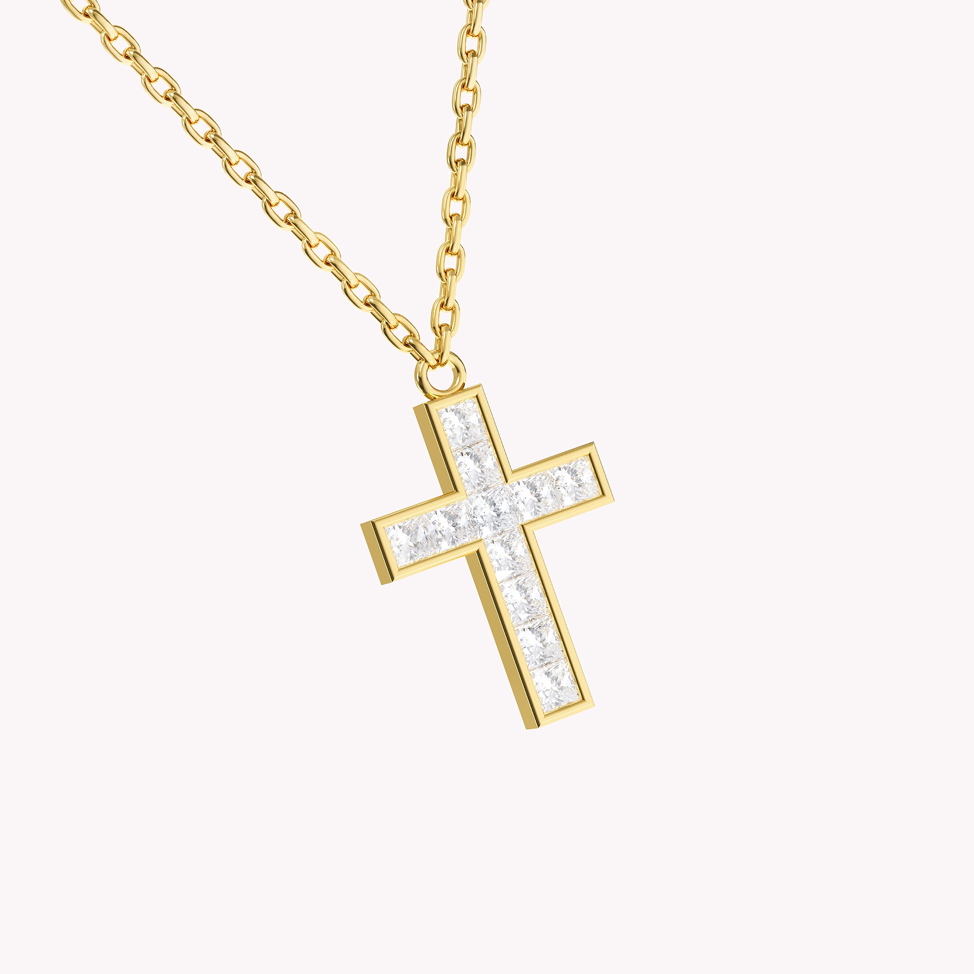 ოქროს ჯვრის გულსაკიდი თეთრი ოქროს ძეწკვით ხელმისაწვდომია სხვადასხვა კარატიანი წონით, სურათზე წარმოდგენილია ჯვარი 0,03 კარატიანი ოთხკუთხედი ბრილიანტებით. თითოეული ბრილიანტი დაფარულია მინიმალური ლითონის გარემოთი, რაც სრულყოფს მათ ბრწყინვალებას.